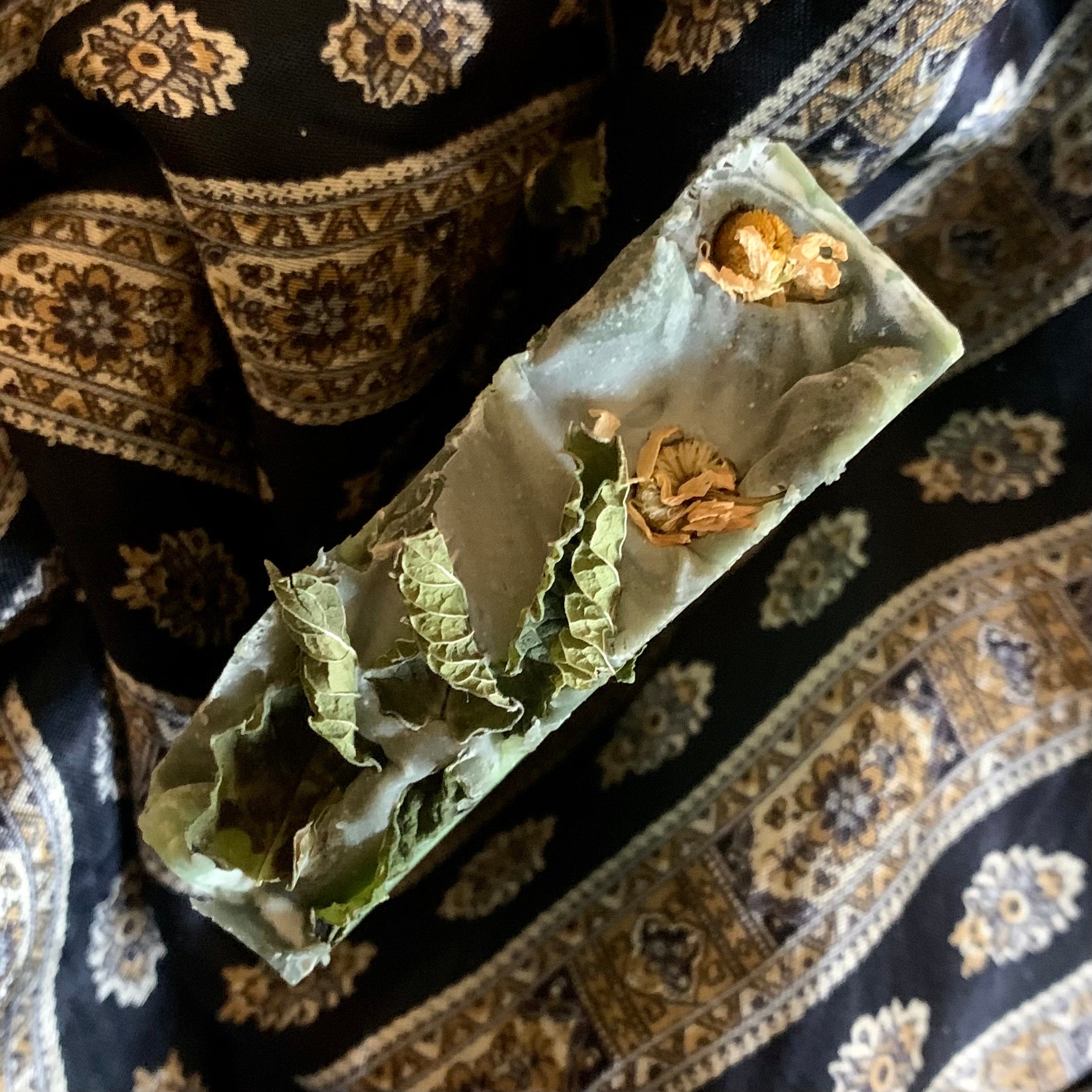 Natural cold process soap made with oils and butters of: avocado, cocoa, grapeseed, hemp, olive, soybean, safflower, sunflower, coconut. pigmented with sustainable coconut carbon and green oxide. Topped with mint leaves and chamomile flowers.